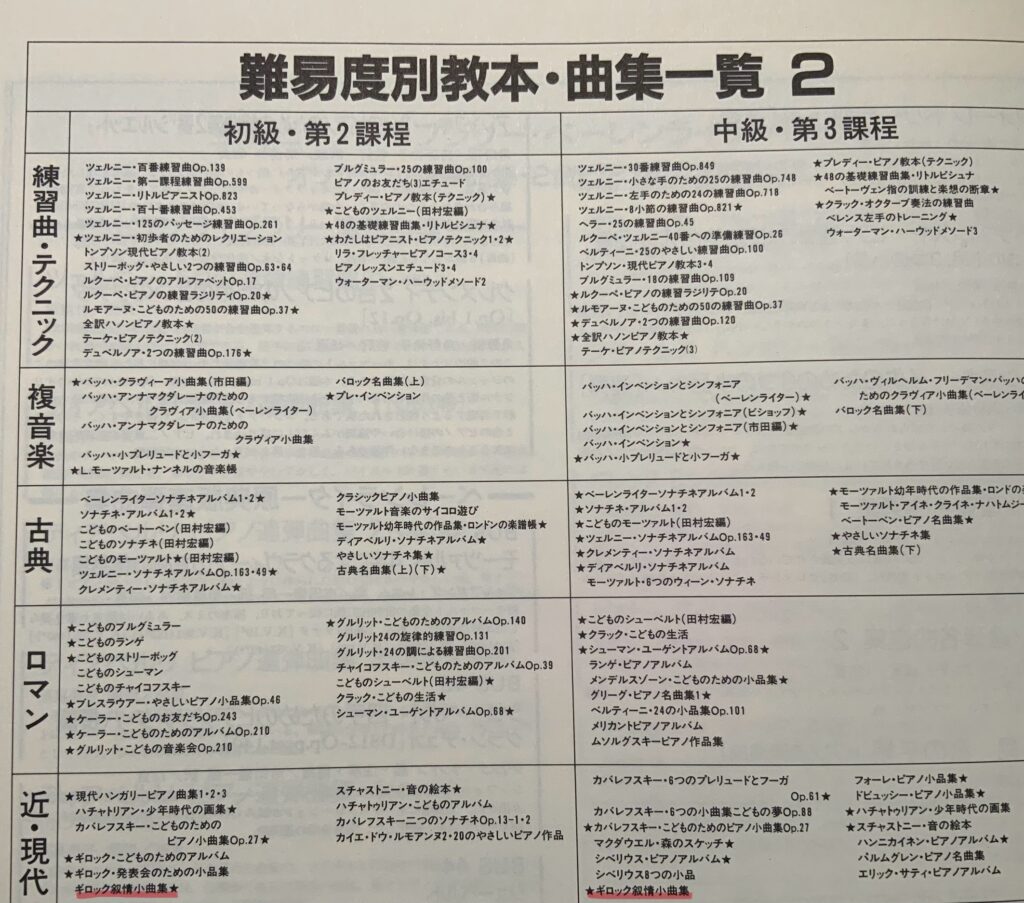 全音の【難易度別教本・曲目一覧】によると、「ギロック叙情小曲集」は初級・第2課程と中級・第3課程のどちらにも記載されています。