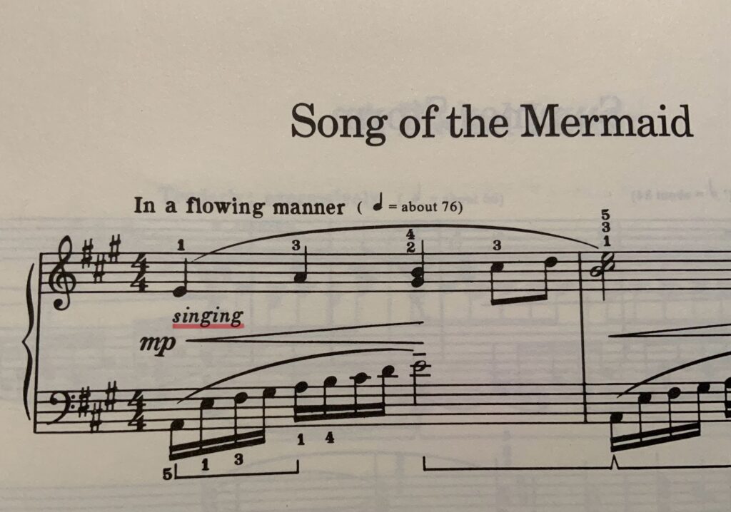 たとえば「人魚の歌」の最初の小節には、英語でsingingと書いてあります。イタリア語の音楽用語では、ふつうcantabile(カンタービレ→「歌うように」の意味)と書かれているでしょう。
