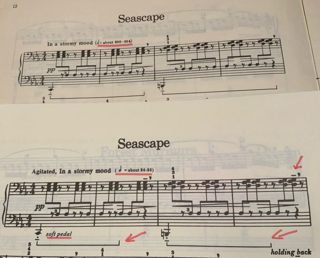 「海の風景」の楽譜の比較↑上が古い版、下が1991年改訂版