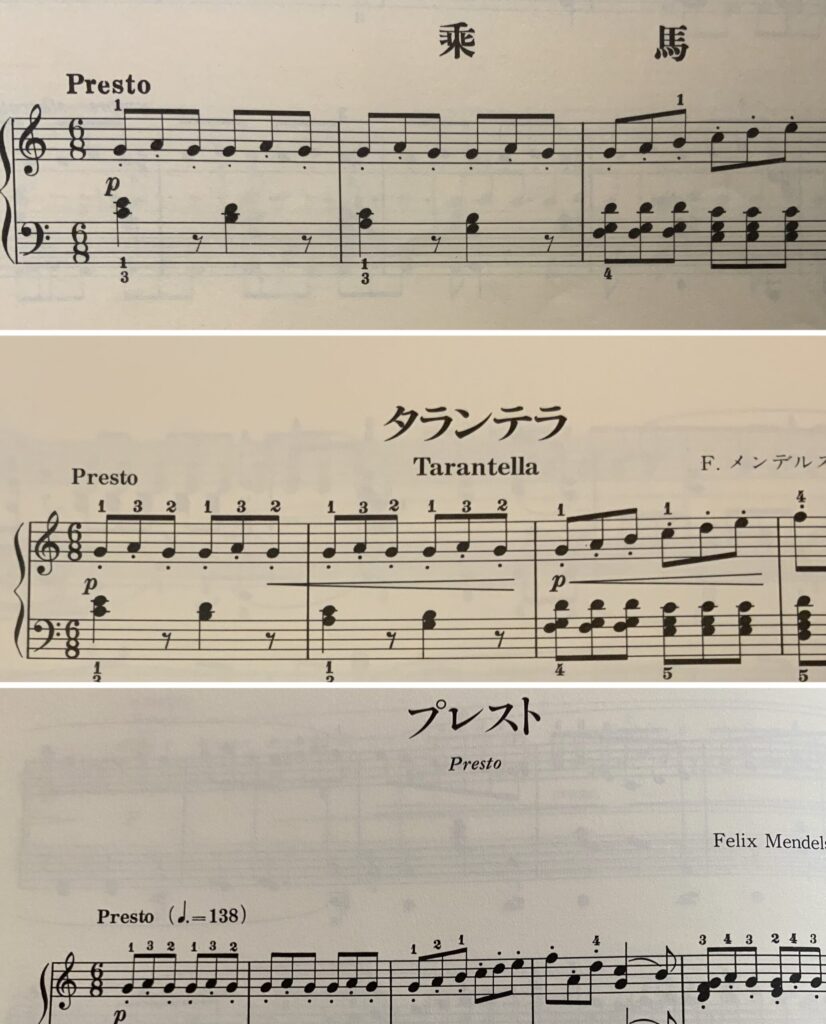メンデルスゾーンの無言歌集から「乗馬」作品102-3。ピアノのためのロマン期名曲集上巻では「タランテラ」、ロマン派ピアノ小品集5では「プレスト」という曲名で収録されています。