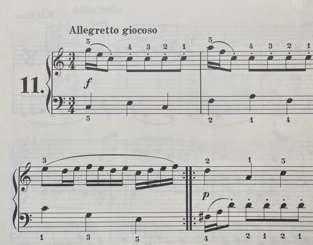 たとえば、第11番テレマン作曲のスケルツィーノ。右手にも左手にも同音連打のスタッカートがたくさん出てくる曲です。