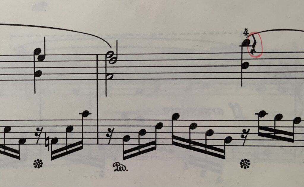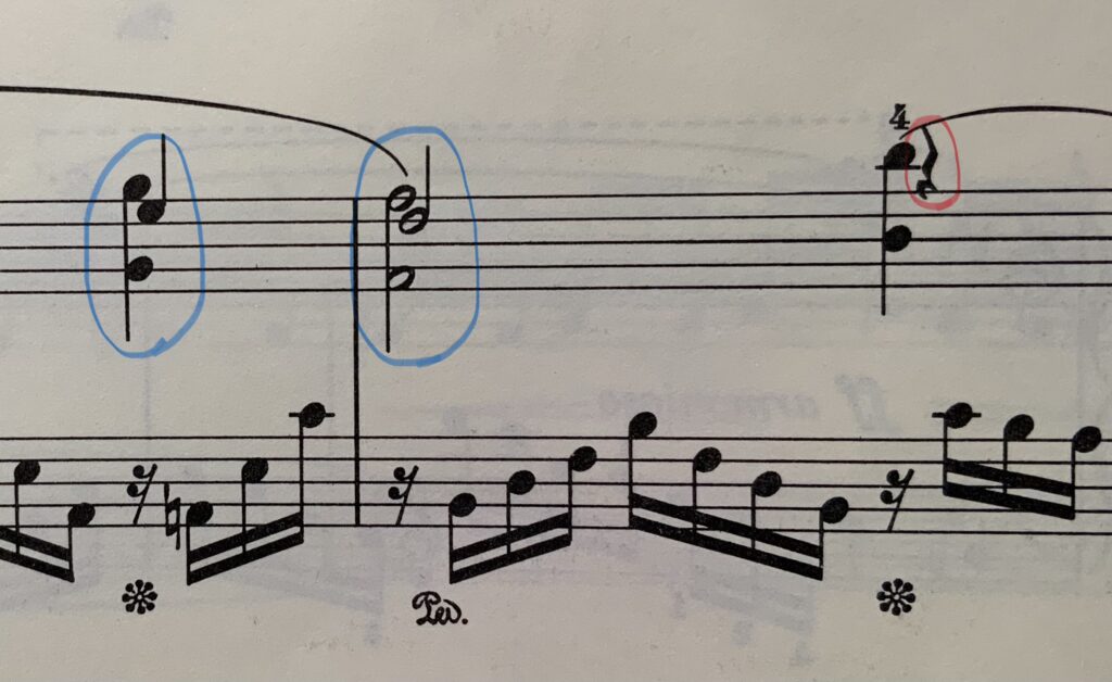 よく見てみると、休符の前から右手は3声部として書かれていることに気がつくと思います。